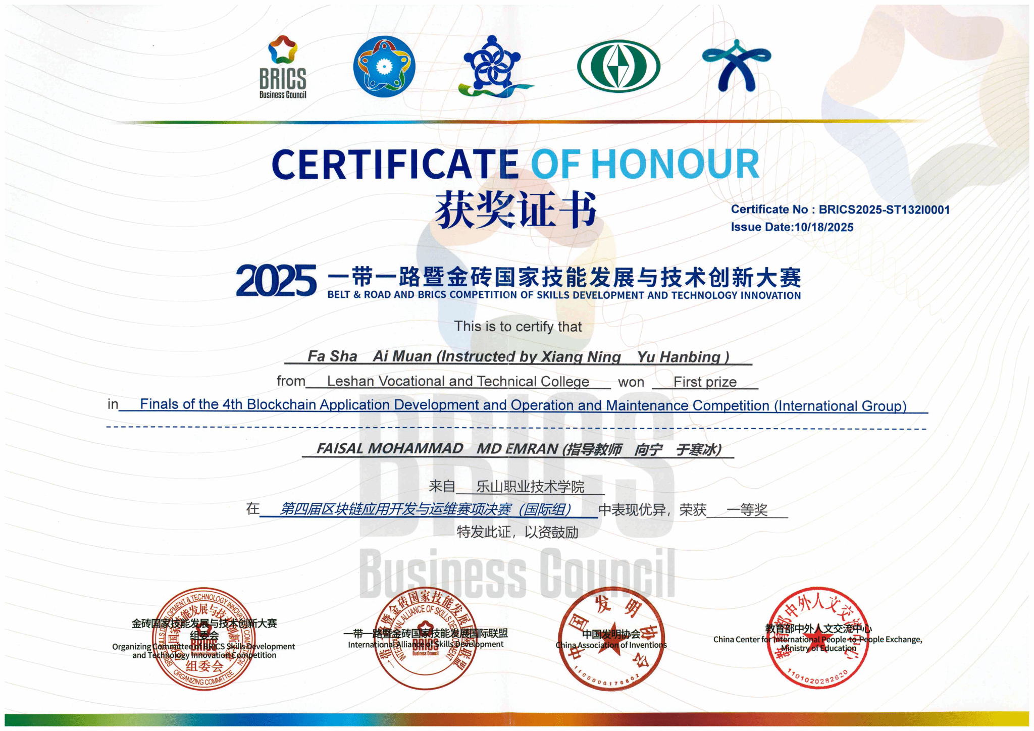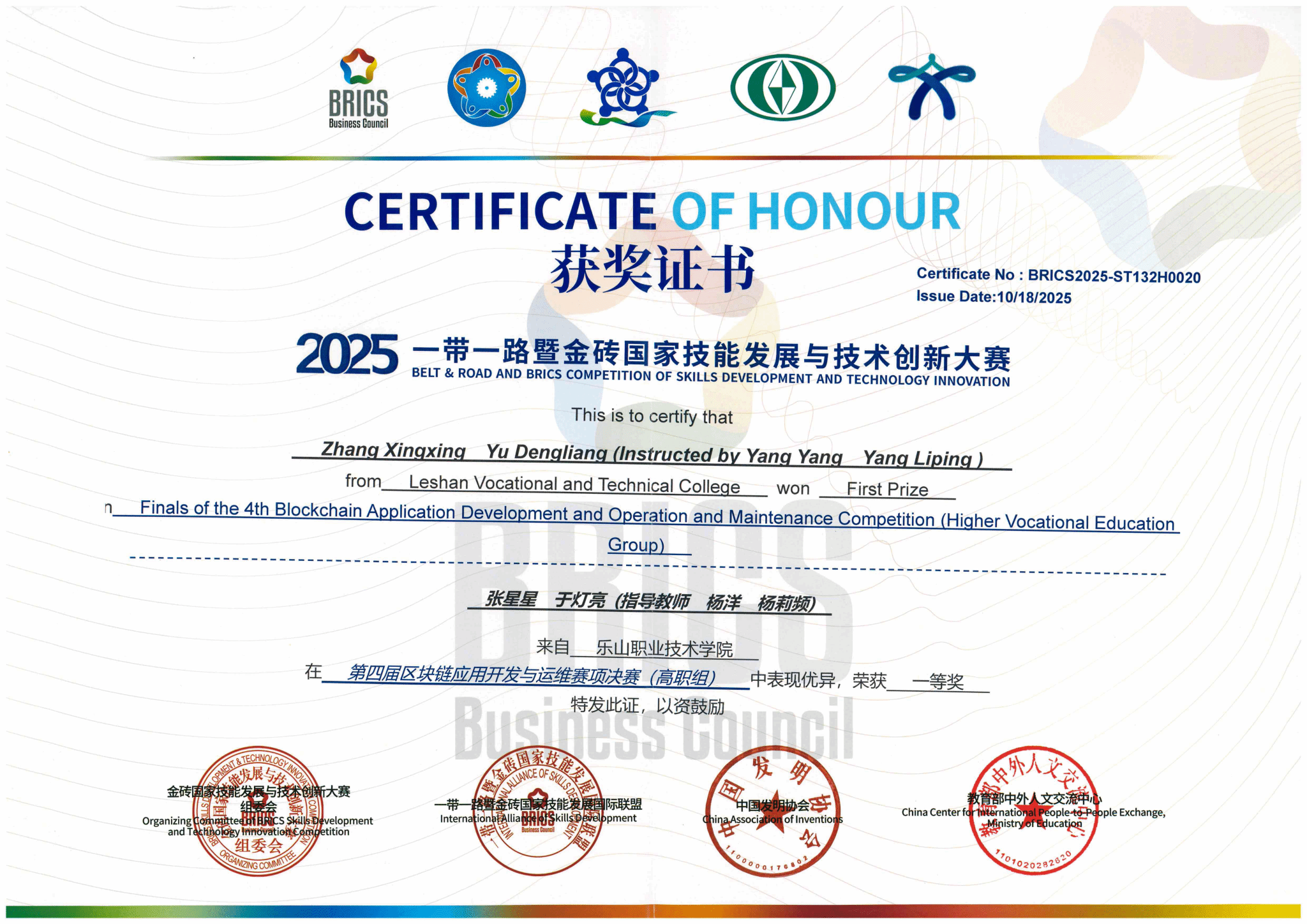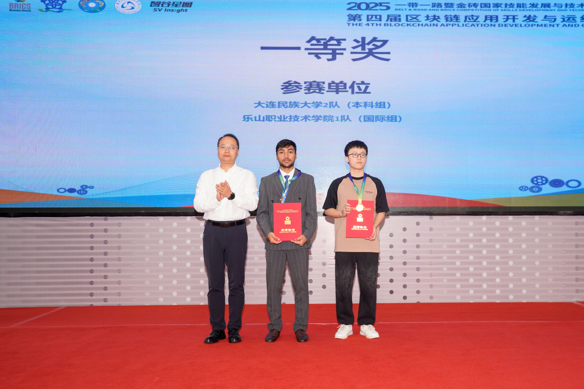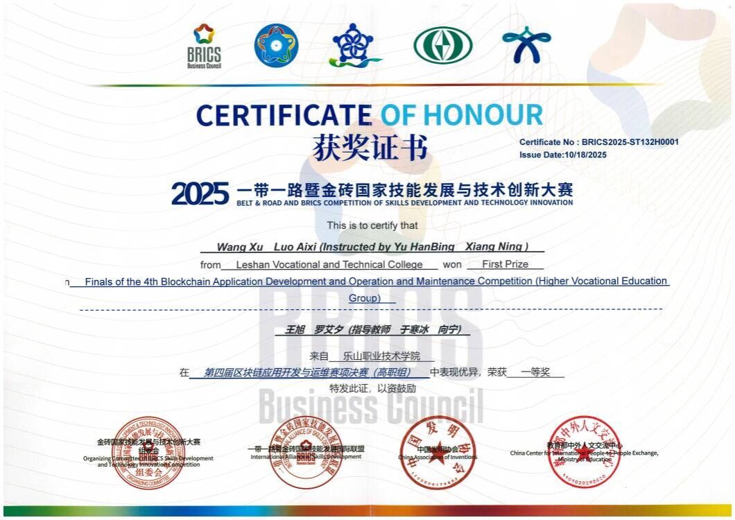 10月17日,2025“一带一路”暨金砖国家技能发展与技术创新大赛之第四届区块链应用开发与运维赛项在我校举行,人工智能学院组织四支队伍参赛。经过紧张激烈的比赛,我校学生共获得高职组、国际组三个一等奖,同时获得国际组二等奖。本届大赛由金砖国家工商理事会中方理事会、“一带一路”暨金砖国家技能发展国际联盟、“一带一路”暨金砖国家技能发展与技术创新培训中心、中国发明协会、教育部中外人文交流中心主办。我校作为联合承办单位之一承办了本次比赛。