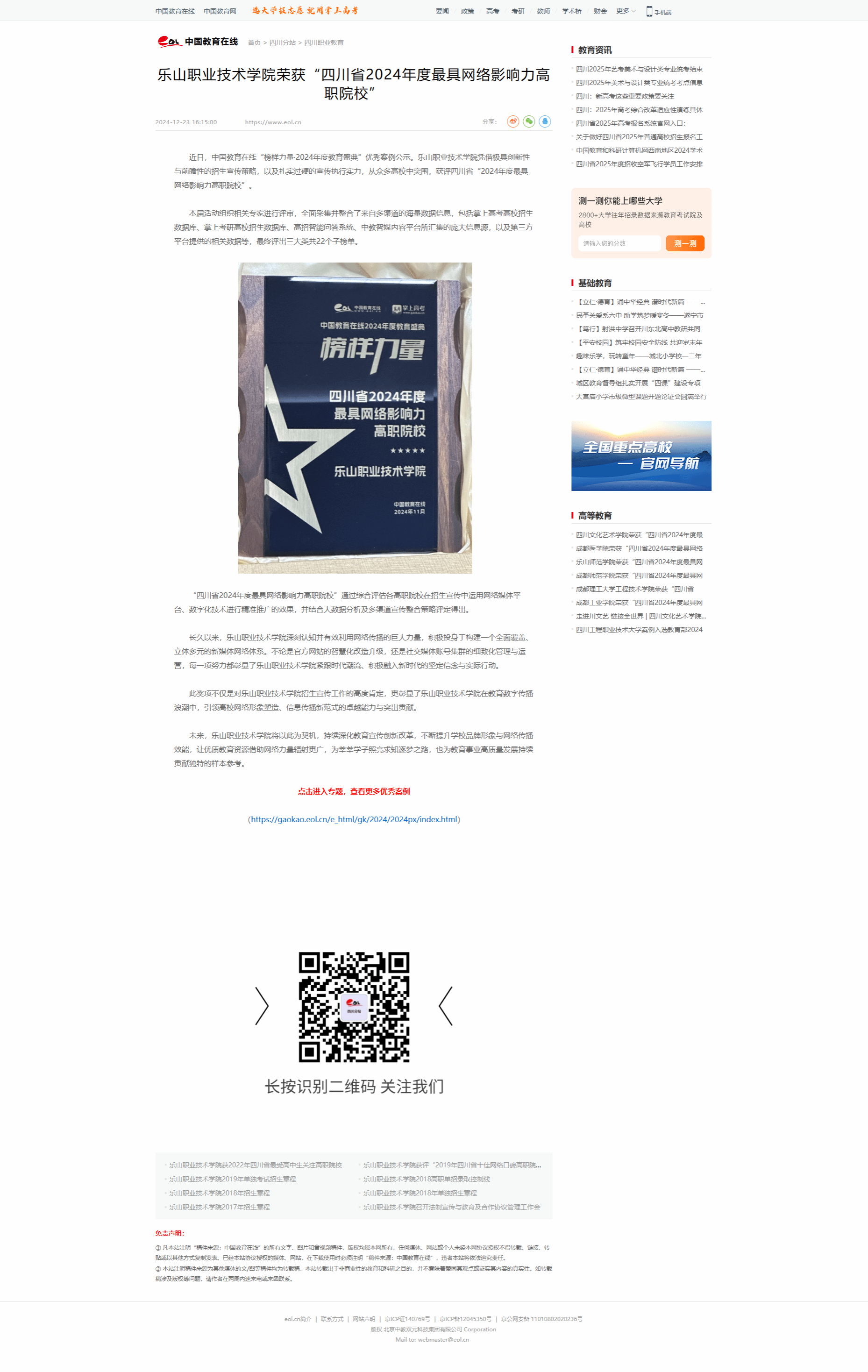 中国教育战线:星空体育平台官方网站荣获“四川省2024年度最具网络影响力高职院校”