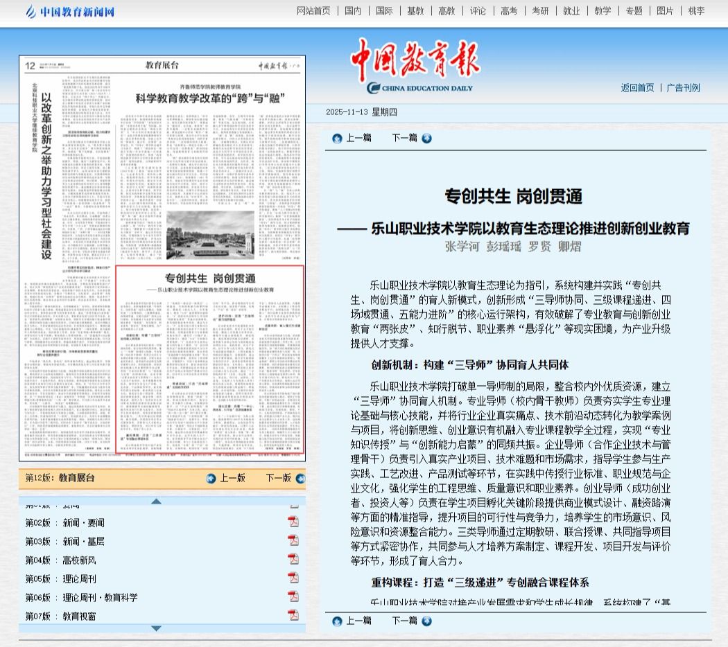 深耕职教沃土,厚植创新基因。星空体育平台官方网站立足教育生态理论,以“专创共生、岗创贯通”为核心,搭建协同育人平台、完善课程体系、贯通实践场域,破解育人难题、赋能学生成长,走出了一条独具特色的高职创新创业教育之路。诸多成果落地、品牌效应凸显,这份育人答卷,见证初心与坚守,更彰显担当与作为!11月13日,《中国教育报》以“专创共生 岗创贯通--星空体育平台官方网站以生态理论推进创新创业教育”为题,对我校的创新创业教育工作成效和特色进行了详细报道。