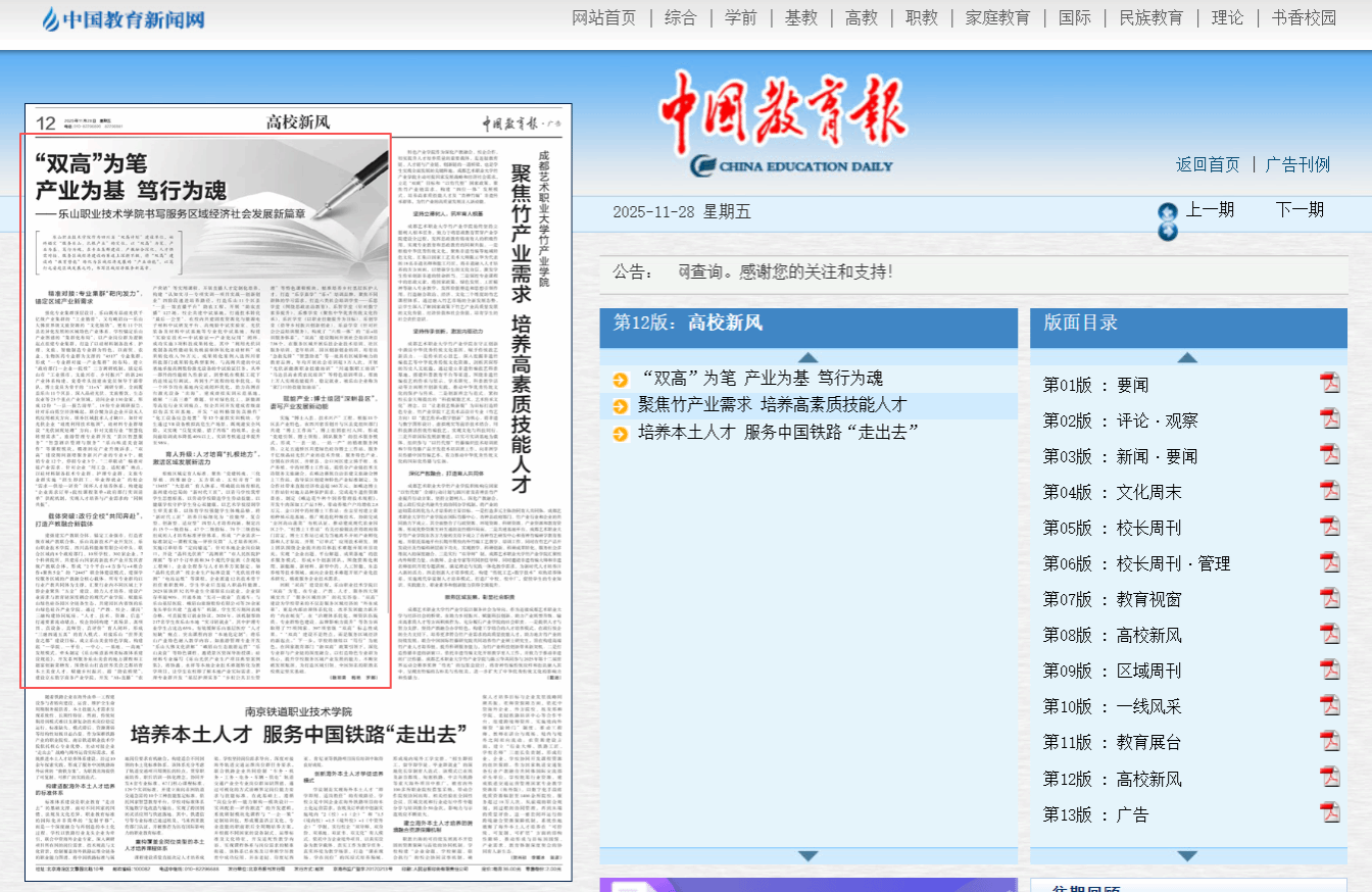 时代浪潮奔涌,职教使命在肩。作为扎根嘉州大地的高等职业院校,星空体育平台官方网站始终锚定“双高计划”建设航向,以产业需求为导向,以实干笃行为底色,深耕职业教育沃土,厚植服务发展根基。从对接区域重点产业培育技术人才,到聚焦产业升级攻坚技术攻关,从深化产教融合构建协同生态,到赋能民生改善传递职教温度,我校始终把自身发展融入乐山经济社会发展大局,以匠心育人才,以实干促发展,在服务产业振兴、推动区域进步的征程中笃定前行,书写着新时代职业教育服务地方发展的崭新篇章。11月28日,《中国教育报》以”‘双高’为笔 产业为基 笃行为魂--星空体育平台官方网站书写服务区域经济社会发展新篇章”为题,对我校“双高”工作特色和成效进行了详细报道。