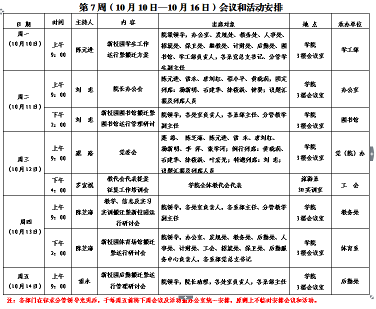 第7周(10月10日—10月16日)会议和活动安排
