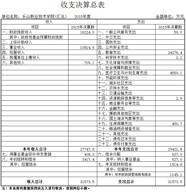 2015年星空体育平台官方网站支出决算总额为31573.5万元,其中:一般公共服务支出50万元,教育支出24376.4万元,科学技术支出2.2万元,医疗卫生与计划生育支出4550.1万元,资源勘探信息等支出2.5万元,住房保障支出450.7万元,转入事业基金627万元,年末结转和结余1514.8万元。支出决算总额较2014年减少815.38万元,主要原因是市财政2015年对新校园建设项目无新增拨款,年末结转结余较2014年年末结转结余减少。