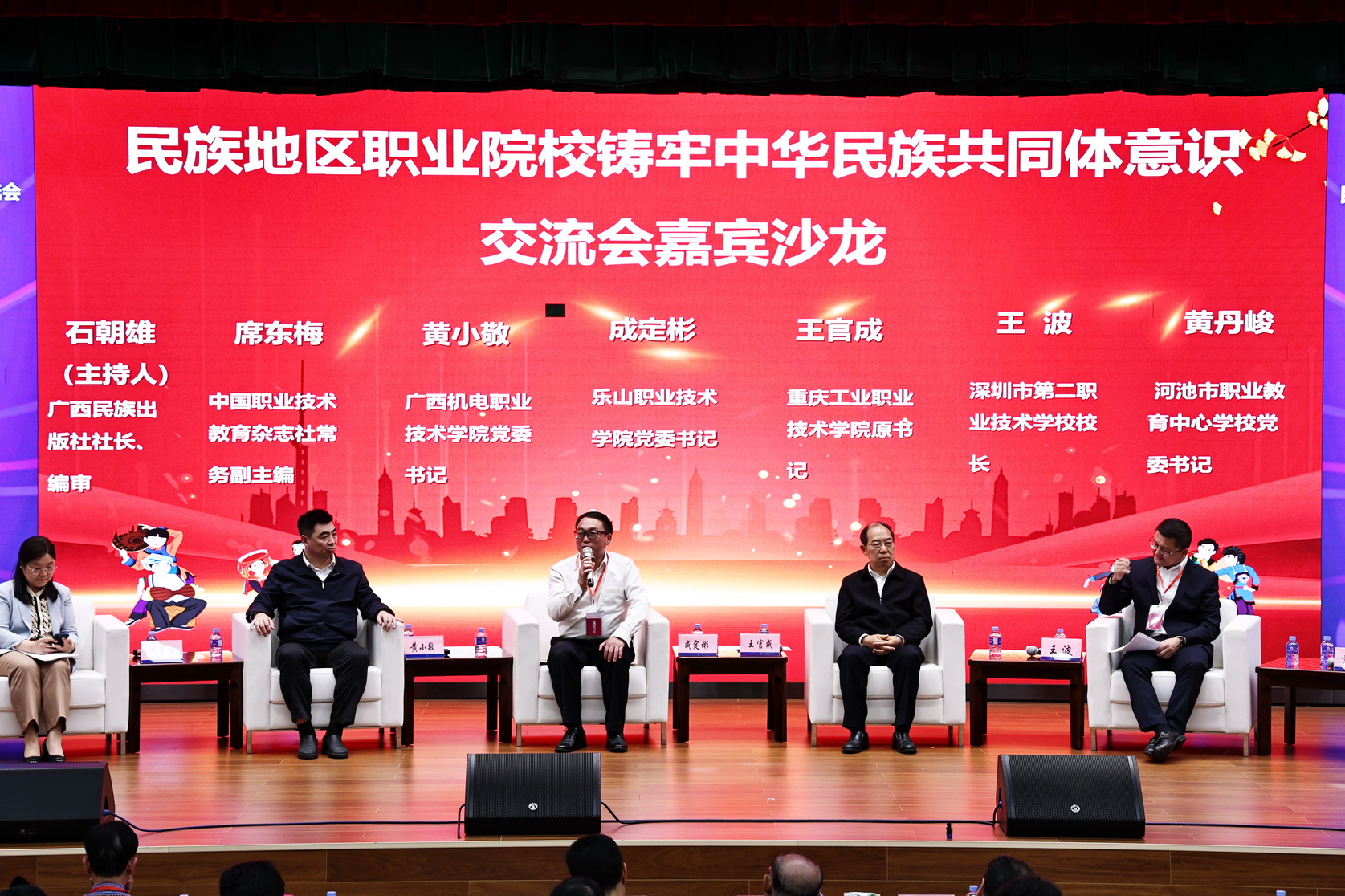 “民族地区职业院校铸牢中华民族共同体意识交流会”由教育部职成司原副司长刘占山主持。教育部民族教育司原一级巡视员葛维威、广西区委党校教授凌经球、中国高教学会职教分会会长周建松、广西社科院民族研究所所长覃娟作主旨报告。在会议“嘉宾沙龙”环节,成定彬应邀同中国职业技术教育杂志社常务副主编席东梅、广西机电职业技术学院党委书记黄小敬、重庆工业职业学院原党委书记王官成、深圳市第二职业技术学校校长王波、河池市职业教育中心学校校长黄丹峻一道,围绕铸牢中华民族共同体意识主题,分享了各单位的经验做法。成定彬就学校利用大学生实践活动铸牢中华民族共同体意识作了经验交流。