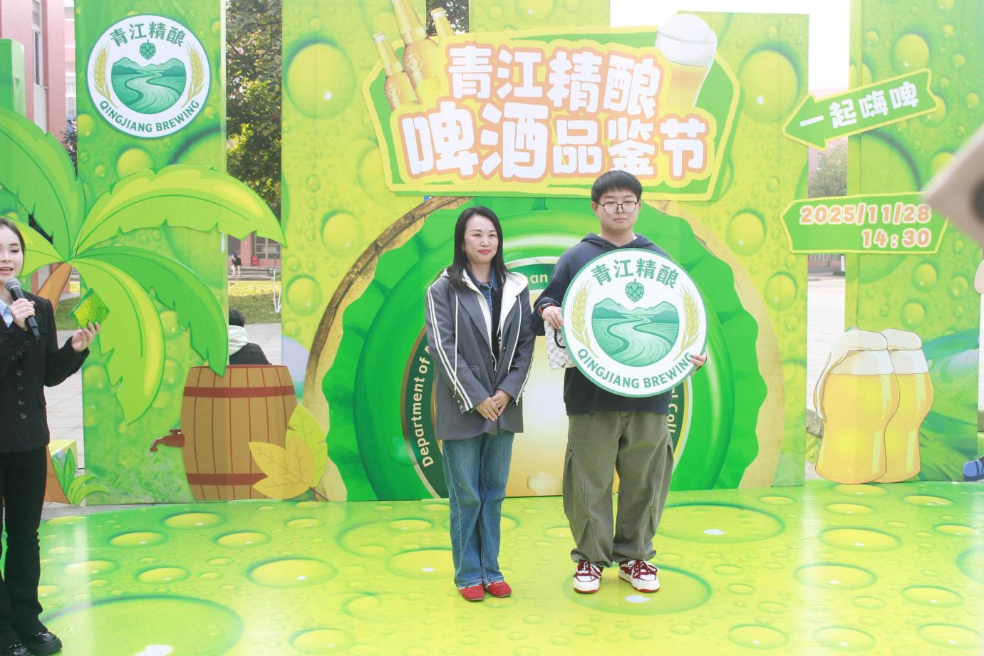 活动前期发起的“青江精酿” Logo 设计大赛反响热烈,共收集作品786份,经评委组严格评审,最终评选出一、二、三等奖共6名。颁奖仪式上,领导、嘉宾分别为获奖者颁奖,获奖作品将青江地域文化、精酿产业特性与青春创意巧妙融合,成为跨学科文创实践的生动注脚。