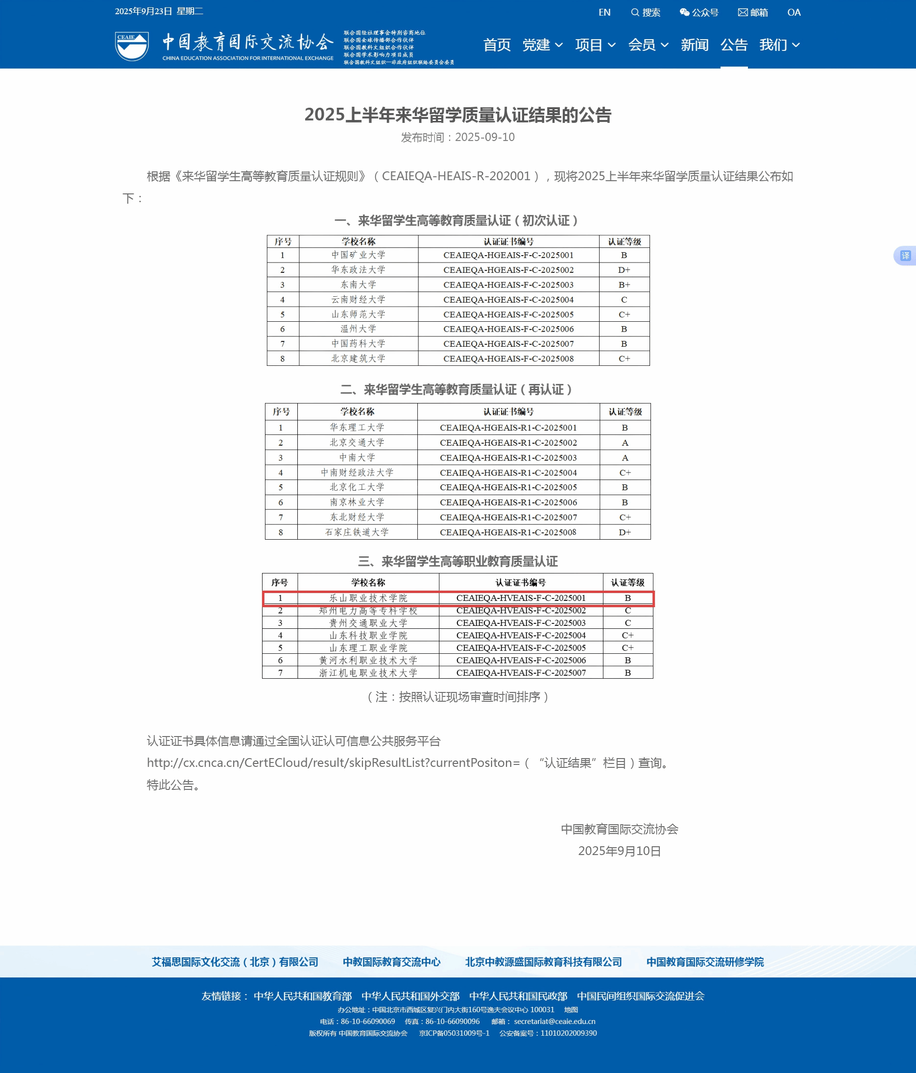 近日,星空体育平台官方网站在由中国教育国际交流协会组织的2025年上半年来华留学质量认证中,获得B级认证结果,认证有效期六年。这是我校首次参与并通过此项国家级质量认证,标志着学校来华留学教育与管理水平达国家公认标准,获权威认可。