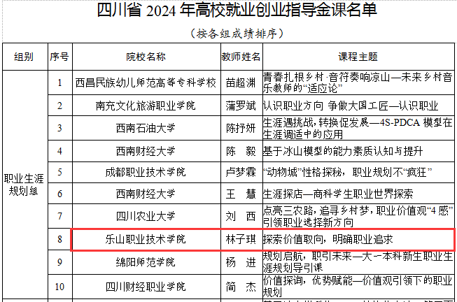 近日,四川省2024年高校就业创业指导金课评选落下帷幕,星空体育平台官方网站教师林子琪参评课程《探索价值取向,明确职业追求》在全省294堂课程中脱颖而出,获评职业生涯规划组金课。