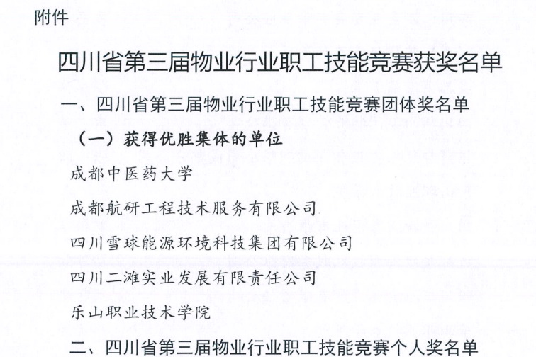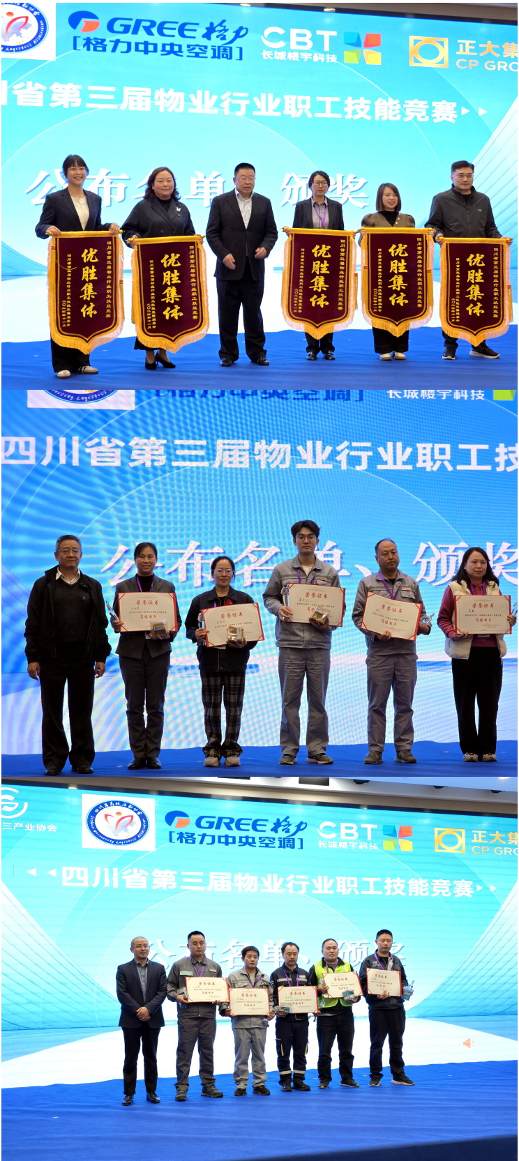 2024年11月16日,四川省第三届物业行业职工技能竞赛在成都举行,星空体育平台官方网站代表队获得“优胜集体奖”,贾笔清、邓媛静、李兴富获得“优秀个人奖”。