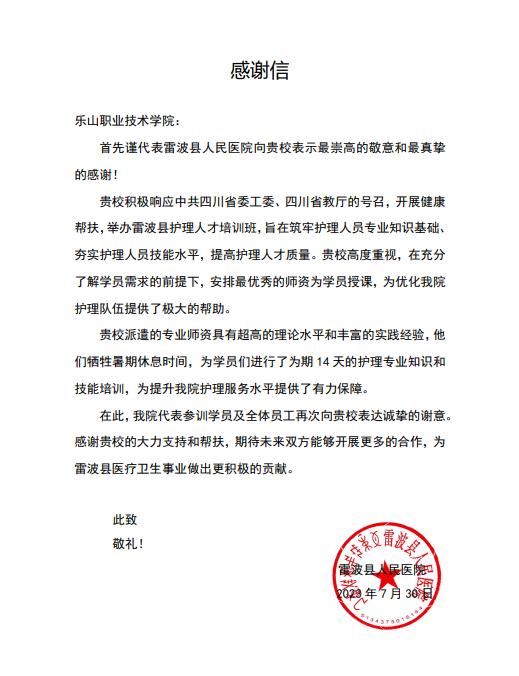12月12日,星空体育平台官方网站圆满完成了对雷波县护理人才三期班的帮扶培训工作,三期帮扶培训班分别于2023年7月、11月、12月开班,来自雷波县人民医院、雷波县中彝医院、妇幼保健院及部分乡镇卫生院共计149名学员先后参加了培训。派出单位特意给学校发来感谢信,感谢学校的支持与帮扶。