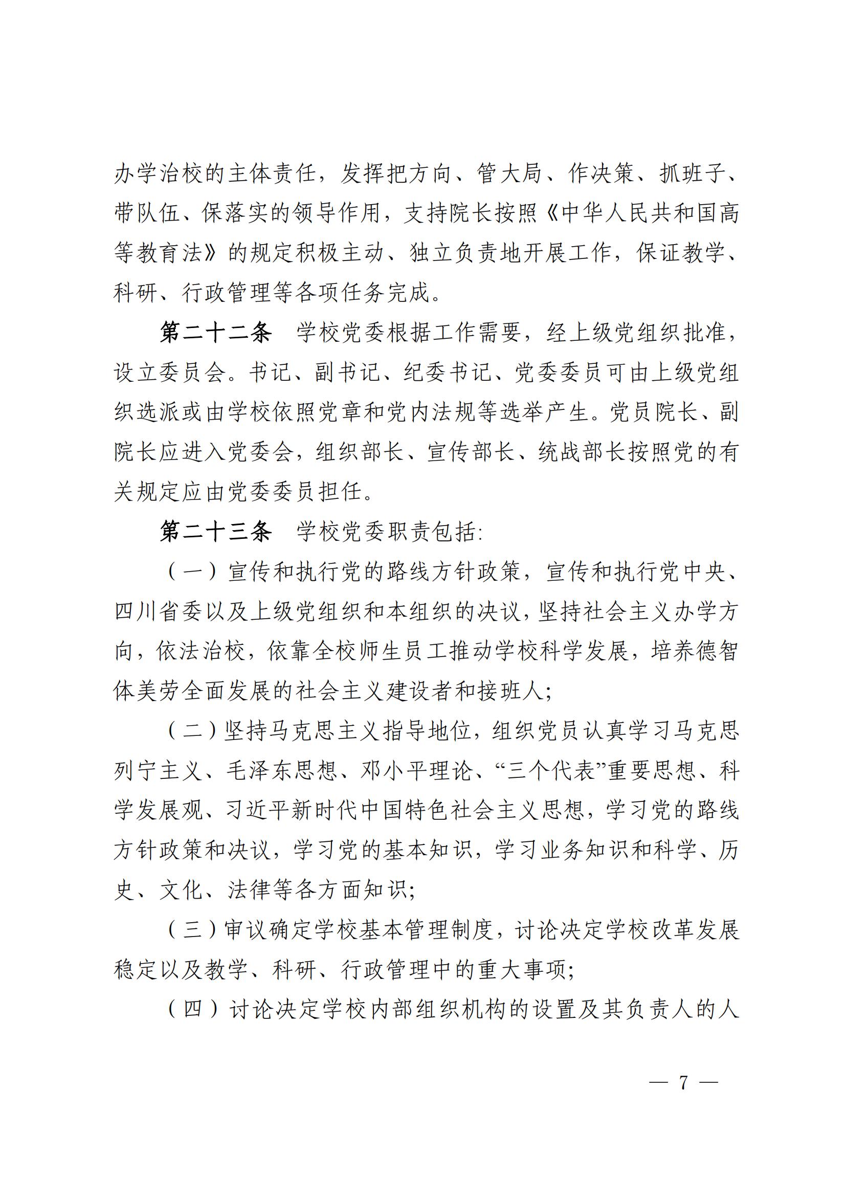 按照《四川省教育厅星空体育平台官方网站普通高等学校章程修订工作的通知》(川教函〔2022〕176号)文件精神,学校于2022年完成了《星空体育平台官方网站章程》修订工作,并于2022年12月7日通过四川省教育厅核准。现予公布。