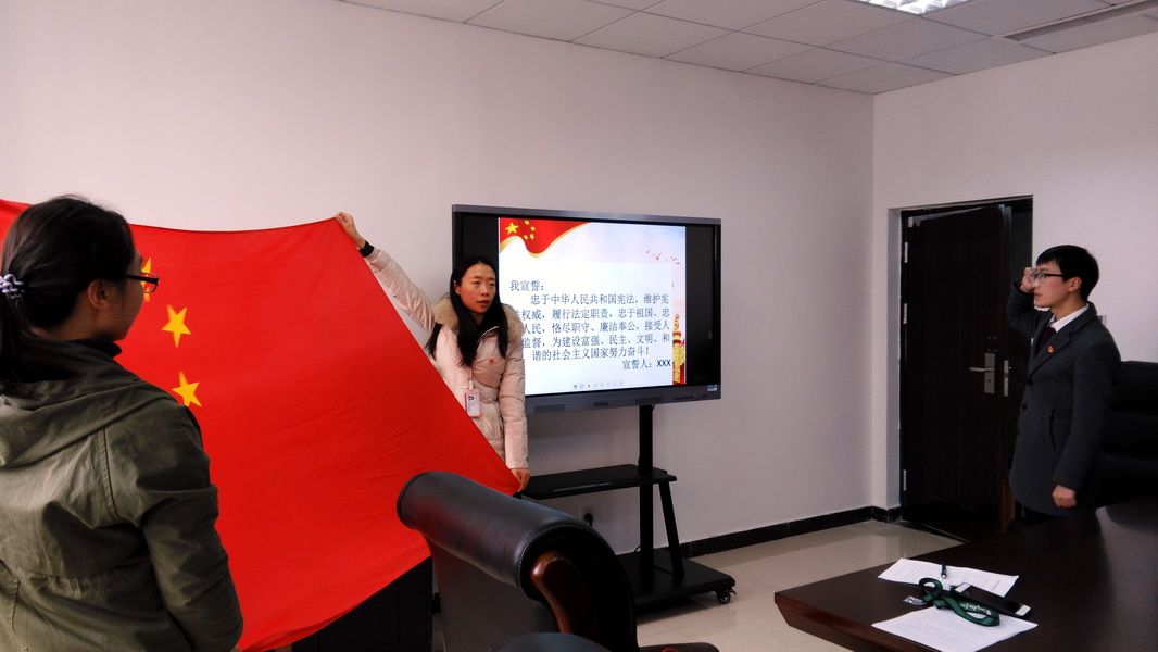面对国旗,所有参会人员右手握拳高举过肩,庄严宣读誓言:“我宣誓:忠于中华人民共和国宪法,维护宪法权威,履行法定职责,忠于祖国、忠于人民,恪尽职守、廉洁奉公,接受人民监督……”。