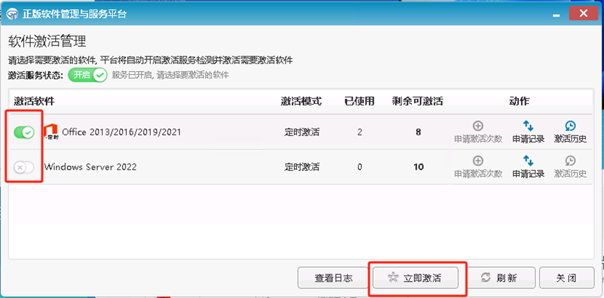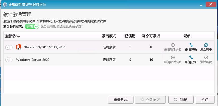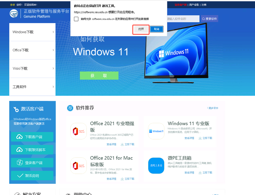 ②登录成功后,浏览器会弹出确认框,点击“打开”,会出现软件自动弹出商品激活管理窗口(Windows和Office默认各分配10次激活次数)